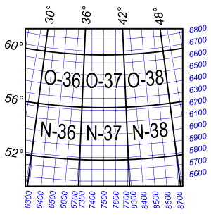 Координата x (подписанная на вертикальных краях листа карты) выражает расстояние до экватора, а координата y (подписанная на горизонтальных краях листа карты) — номер зоны (первые одна или две цифры значения) и положение относительно центрального меридиана зоны (последние три цифры значения). Центральному меридиану зоны присваивается значение 500 км (так как ширина зоны не может превышать 668 км, трёхзначного числа достаточно, чтобы выражать координату y в её пределах). Например, точка с координатами x = 6216 и y = 7350 находится в 6216 км от экватора и в 150 км (500−350=150) к западу от базового меридиана 7-й зоны (39° в. д.).