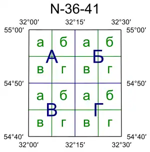 Лист карты масштаба 1:25 000 (250 м в 1 см) получается делением листа карты масштаба 1:50 000 на четыре части; номенклатура его образуется из номенклатуры пятидесятитысячной карты с добавлением одной из строчных букв а, б, в, г русского алфавита; например, N-37-56-А-б.