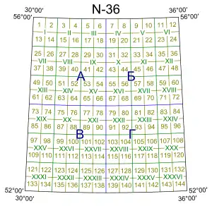 Карты масштаба 1:200 000 (2 км в 1 см) образуются делением миллионного листа на 36 частей (рис. 3); их номенклатура состоит из обозначения листа карты масштаба 1:1 000 000 с добавлением одной из римских цифр I, II, III, IV, …, XXXVI. Например, лист с городом Рязань имеет номенклатуру N-37-XVI.