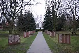 В братских могилах захоронен 3001 солдат и офицер Советской армии. 2403 из павших числятся неизвестными. Среди известных похороненных здесь - Б. Г. Комаров, полный кавалер ордена Славы.