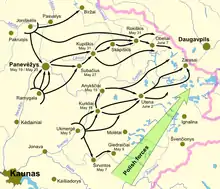 Войска из Укмерге первыми начали активные боевые действия под Зарасай, захватили его 25 августа и далее прошли около 30 км. Войска из Паневежиса вместе с поляками 26 августа начали наступать вдоль железной дороги к Турманту и РККА начала отступать, сократив фронт, на север через реку Даугаву. К 31 августа к югу от Даугавы РККА контролировала только Гриву (пригород Даугавпилса), но затем и её потеряла.