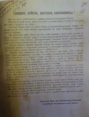 Поручить т. Радеку руководство всей печатной агитацией и ознакомление общественного мнения с позицией России и польского правительства в польском вопросе, чтобы могущая возникнуть война с Польшей была правильно понята русскими и польскими массами как нападение империалистской Польши в угоду Антанте на желающую мира Советскую Россию.