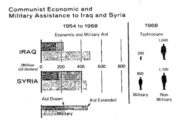 С середины 1950-х годов по середину 1960-х годов около ⅓ от общей суммы советских военных поставок за рубеж приходилось на Сирию, Ирак и Афганистан — каждая из этих стран получила оружия на сумму свыше 200 млн долларов[13]:719. Помимо оружия, в Сирию (как и в Египет) из СССР в больших количествах поставляли нефтепродукты — своей нефтепереработки там попросту ещё не было. Его предстояло создать советским инженерам[9]:2,4. В связи с этим Дмитрий Саймс отмечает следующую взаимозависимость: вооружение Египта и Сирии быстро отразилось на нефтяной отрасли — произошёл резкий скачок цен на нефть[14]:430.
