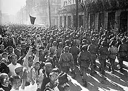 Вступление Советского государства в войну против Японии вызвало одобрение как со стороны китайских коммунистов, так и со стороны гоминьдановцев. Председатель Компартии Китая Мао Цзэдун и командир 8-й армии Чжу Дэ 8 августа направили И. В. Сталину телеграмму, в которой приветствовали от имени китайского народа объявление войны Японии[36]. Лидер партии «Гоминьдан» Чан Кайши в своей телеграмме Сталину от 9 августа писал: «Объявление Советским Союзом с сегодняшнего дня войны против Японии вызвало у всего китайского народа чувство глубокого воодушевления. От имени Правительства, народа и армии Китая имею честь выразить Вам, а также Правительству и героическому народу и армии Советского Союза искреннее и радостное восхищение»[37]. Тогда же вышла статья Мао Цзэдуна «Последняя битва с японскими захватчиками». В ней говорилось: