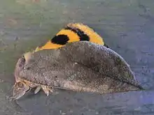 Длина переднего крыла 45—48 мм. Размах крыльев 80—130 мм. Тело и крылья опушены густыми волосками. Передние крылья коричнево-буроого цвета с зеленоватым и фиолетовым отблеском, неясными зеленоватыми пятнами и двумя тонкими линиями. Вершина передних крыльев заострена. Задние крылья оранжево-жёлтые с чёрным крючковидным пятном и чёрной перевязью у внешнего края[2].