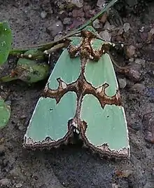 Длина переднего крыла 17—21 мм. Размах крыльев 36—46 мм. Основная окраска передних крыльев бабочки изумрудно-зелёная. Имеется маленькая бурая точка в большом зелёном пятне, разорванная по середине и внешнему краю волнистой светло-бурой полосой. Передние крылья зубчатые с серо-коричневыми перевязями через центр крыла, а также у их внешнего края. Задние крылья серо-коричневого или буро-коричневого цвета, со светлым прикорневым полем. Бахромка задних крыльев пёстрая.