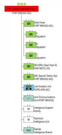 Совместно с частями постоянной боевой готовности к выполнению специальных заданий по приказу Совместного командования специальных операций могут привлекаться также подразделения 75-го полка рейнджеров и 160-го авиаполка СпН армейской авиации (в том числе, в составе 121-й, позже 145-й оперативной группы (ОГ) СпН по Ираку и Афганистану).[7][8][9]
