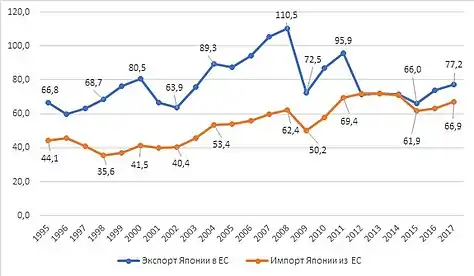 Динамика экспортных и импортных операций между Японией и ЕС в 1995—2017 гг., млрд долл. США[7][8]