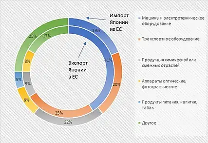 Если говорить о товарной структуре экспорта и импорта, то в экспорте в ЕС преобладают автомобили, оптические и медицинские инструменты и химикаты. В импорте из ЕС преобладают автомобили, фармацевтические препараты, оптические и медицинские инструменты и электрические приборы, а также продовольствие. Как можно заметить, торговля между ЕС и Японией в основном имеет внутриотраслевую направленность. Так, например, экспорт химических веществ и продуктов в ЕС включает высокоэффективные, функциональные, химические материалы, такие как защитные плёнки для ЖК-дисплеев, поляризаторы, сложные полупроводники и углеродные волокна[12]. Тогда как импорт химических веществ и продуктов из ЕС в Японию включает такие продукты, которые применяются в производстве высокотехнологичной продукции в IT сфере, автомобилестроении, робототехнике.