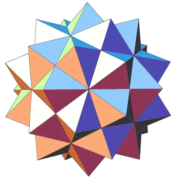 Это вторая звёздчатая форма икосаэдра. Соединение пяти октаэдров состоит из граней второго отсека. Эти грани —соединения из двух треугольников. Из-за того, что грани — соединения из многоугольников, граней у этого многогранника не 5 • 8 = 40, а 20.