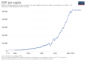 Соединённые Штаты — высокоразвитая страна, являющаяся крупнейшей экономикой мира по номинальному ВВП и второй по ВВП (ППС). Хотя население страны составляет лишь 4,3 % от общемирового[9], американцам принадлежит около 40 % совокупного мирового богатства[10]. Соединённые Штаты занимают лидирующие позиции в мире по ряду социально-экономических показателей, включая среднюю зарплату[11], ИЧР, ВВП на душу населения и производительность труда[12]. В то время как экономика США является постиндустриальной, характеризуется преобладанием сферы услуг и экономики знаний, производственный сектор страны остаётся вторым по величине в мире[13].