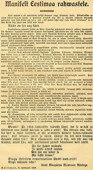 24 февраля Исполком Советов Эстляндии и Ревельский Совет рабочих и солдатских депутатов покинули город Ревель, в котором в этот же день Комитет спасения Эстонии опубликовал «Манифест всем народам Эстонии», объявлявший Эстонию независимой демократической республикой, нейтральной по отношению к российско-германскому конфликту («Манифест народам Эстонии» был также оглашён вечером 23 февраля в Пярну членом Маапяэва Хуго Кууснером). В тот же день Константин Пятс был избран главой Временного правительства Эстонии.