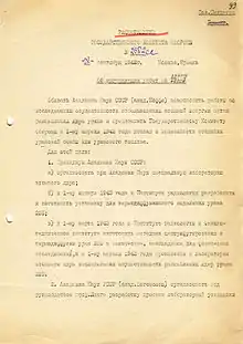 Обязать Академию наук СССР (акад. Иоффе) возобновить работы по исследованию осуществимости использования атомной энергии путём расщепления ядра урана и представить Государственному комитету обороны к 1 апреля 1943 года доклад о возможности создания урановой бомбы или уранового топлива…