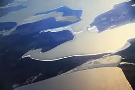 ![]() Северная часть Чонгарского полуострова, Соколовское озеро (на переднем плане). Вид с высоты 12000 м | |