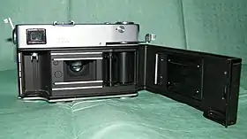 - На нижней крышке фотоаппарата расположены кнопка обратной перемотки и счётчик кадров. При открывании задней стенки счётчик кадров автоматически сбрасывается.