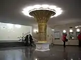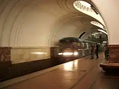 Путевые стены станции украшены четырьмя огромными панно из белого мрамора. По первоначальному плану было задумано, что на них будут записаны слова из сталинской Конституции о правах советского гражданина: «Право на труд», «Право на образование», «Право на отдых», «Право на обеспеченную старость»[25]. Планы не сбылись.