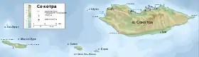 Архипелаг состоит из главного острова Сокотра (3625 км²[5]), острова Абд-эль-Кури (133 км²), двух небольших островов под общим названием «Аль-Ихван» («Братья») — Самха (41 км²) и Дарса (около 5 км²)[6], а также двух небольших необитаемых скальных образований — Сабуния (0,03 км²) и Каль-Фираун (0,09 км²).