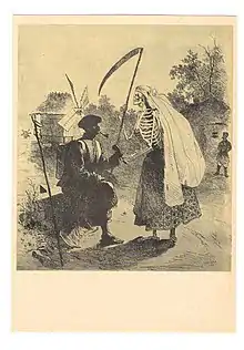 Также существует сюжет о путешествии солдата на «тот свет». Поднявшись на лестнице, он оказывается в раю, но привратники Святые Петр и Павел его отправляют обратно. В Аду он встречает бесов[9].