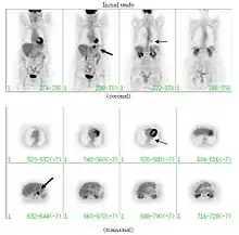 При среднем риске злокачественности, по возможности, проводится плановое ПЭТ-исследование (позитронно-эмиссионная томография). Приблизительно у 95 % пациентов со злокачественным новообразованием в лёгком ПЭТ-картина обнаруживает патологические изменения в лёгочной ткани; у 78 % пациентов с доброкачественным новообразованием ПЭТ-картина патологию не обнаруживает[7]. Таким образом, позитронно-эмиссионная томография надёжно выявляет злокачественные новообразования в лёгких, однако в ряде иных случаев (например, при воспалении, инфекционном процессе) патологический очаг также выявляется. При диаметре образования менее 1 см проведение ПЭТ не целесообразно в связи с повышенной возможностью ложно-отрицательного результата[7][8][9]. Злокачественные новообразования обычно имеют высокий метаболизм, что проявляется при ПЭТ высоким потреблением фтордезоксиглюкозы (ФДГ).
