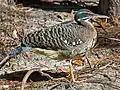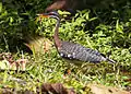 Среднего размера птица 46-53 см длиной и массой 180—220 г. Оперение верхней части тела пёстрое с преобладанием тёмно-коричневого и тёмно-серого цветов, но также с зеленовато-желтыми, белыми и чёрными тонами. Голова относительно небольшая, почти полностью чёрная с белыми горизонтальными полосками над и под глазами. Клюв средних размеров, с чёрным надклювьем и оранжевым подклювьем. Радужная оболочка глаз рубинового цвета. Шея тонкая и длинная, в районе горла белая. Крылья широкие, закруглённые. Хвост веером, с двумя широкими горизонтальными полосами чёрно-коричневого и чёрного цвета. Ноги длинные, оранжевые, строением напоминают ноги цапель. Половой диморфизм не выражен.