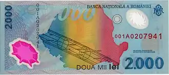 ![]() Банкнота в 2000 лей выпуска 2000-2003 годов с обозначением прохождения солнечного затмения |