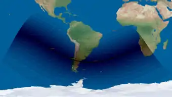 Частные фазы затмения были видны на большей части территории Южной Америки (юг и запад Эквадора, почти вся территория Перу (кроме её крайней северо-восточной части), южная половина Бразилии, Боливия, Парагвай, Чили, Аргентина, Уругвай) и на крайнем юго-западе Африки (ЮАР, Намибия, западная половина Ботсваны, юго-западная половина Анголы)