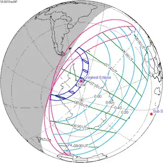 Частные фазы затмения были видны во всей Антарктиде, на юге Африки, на крайнем юго-востоке Австралии (штат Виктория и остров Тасмания) и в южных частях акваторий Атлантического, Индийского и Тихого океанов.