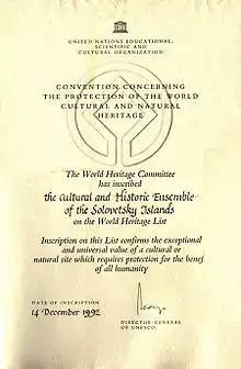 В 1992 году произошло включение Соловецкого историко-культурного комплекса в список Всемирного наследия ЮНЕСКО, а в 1995 году — в Государственный свод особо ценных объектов культурного наследия народов Российской Федерации.