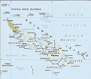 ![]() Белый цвет — государство Соломоновы острова; на северо-западе зелёным цветом отмечен остров Бугенвиль (принадлежит государству Папуа — Новая Гвинея) | |