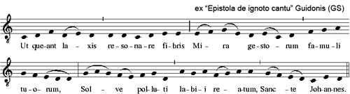 Сольмизационные слоги ut, re, mi, fa, sol, la заимствованы Гвидо (в «Письме о незнакомом распеве», ок. 1030) из первой строфы гимна св. Иоанну «Ut queant laxis» (стихи Павла Диакона), при распеве которого начальные слоги стихотворных строк попадают на ступени восходящего натурального гексахорда, в латинской буквенной нотации C-D-E-F-G-A: