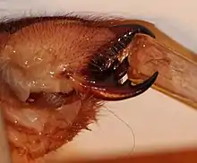 Крупные хелицеры являются одним из самых заметных признаков сольпуг. Из всех паукообразных сольпуги обладают самыми крепкими и упругими хелицерами, способными прокусить человеческий ноготь. Каждая из двух хелицер имеет две части, скреплённые суставом[5], что в совокупности образует клешню, похожую на клешню краба. На хелицерах расположены зубы, количество которых варьирует от вида к виду[6][4]. Мощность хелицер позволяет сольпугам срезать шерсть и перья жертвы или падали, прорезать кожу и даже тонкие косточки (птиц)[7]. При нападении сольпуги издают пронзительный писк или стрекотание трением хелицер друг о друга[8].