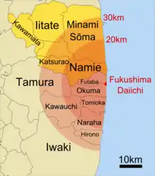 - Намиэ (из уезда Футаба) - приказ об эвакуации был отменен 31 марта 2017 года, но по состоянию на 2019 года «труднодоступная территория» по-прежнему занимает большую часть посёлка (приказ об эвакуации отменён только на юго-востоке посёлка)[9][7]