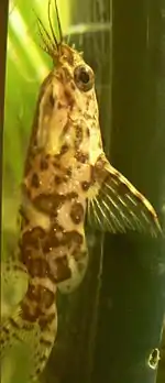 Тело коренастое, несколько сплющено по бокам. Спина более выпуклая, чем брюшко, глаза большие, рот нижний с тремя парами усиков, хвостовой плавник двухлопастный. Спинной плавник треугольной формы и имеет мощный первый луч. Большой жировой плавник. Окраска серовато-бежевая с разбросанными по телу и плавникам черно-коричневыми пятнами. Брюшко темнее спины. Половой диморфизм выражен слабо: тело самки в больших пятнах, самец мельче и стройнее самки (самцы вырастают до 6 см в длину, самки — до 9,5 см).