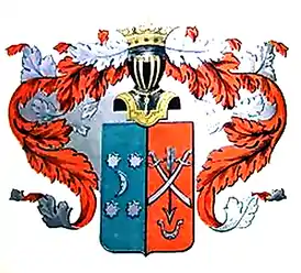 Щит разделён перпендикулярно на две части, из них в левой в голубом поле изображён серебряный Полумесяц и по сторонам его по две серебряных Звезды (изм. польский герб Држевица). В правой части, в красном поле, крестообразно положены две серебряных Сабли (изм. польский герб Пелец) и Стрела, остриями обращённые к Подкове, внизу означенной (изм. польский герб Рудница).