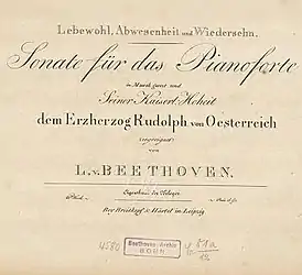 Соната для фортепиано № 26 ми-бемоль мажор, op. 81a («Прощальная») была написана Бетховеном в 1809—1810 годах. Она посвящена эрцгерцогу Рудольфу Австрийскому и получила своё название по случаю его вынужденного отъезда из Вены во время войны Пятой коалиции. Под первыми тремя нотами сонаты Бетховен написал подтекстовку: Lebewohl («Прощайте»).