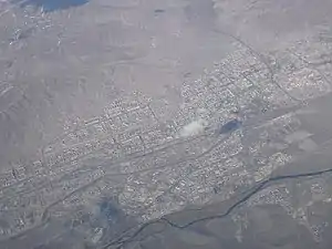 Вид на Улан-Батор с воздуха, 22 сентября 2005 года. Малозаселенная территория верхнем левом углу - Сонгинохайрхан. По плотности населения и транспортной системе Сонгинохайрхан значительно отстает от остальных районов Улан-Батора.