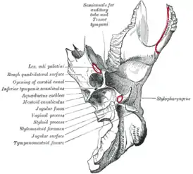 ![]() Левая височная кость. Вид снизу. "Отверстие сонного канала" ("Opening of carotid canal") отмечено слева по центру. | |