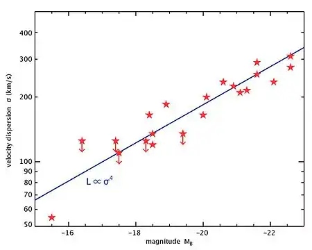 где показатель степени приблизительно равен 4, но зависит от диапазона светимостей, в который вписано соотношение. Данную зависимость можно рассматривать как проекцию фундаментальной плоскости эллиптических галактик.