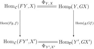 Чтобы понять, что подразумевается под естественностью Φ, нужно объяснить, каким образом homC(F-, -) и homD(-, G-) являются функторами. На самом деле, они оба являются бифункторами из Dop × C в Set. В явном виде естественность Φ означает, что для всех морфизмов f : X → X′ в C и морфизмов g : Y ′ → Y в D следующая диаграмма коммутирует: