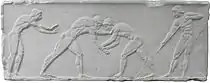 - Длинный бег (др.-греч. δόλιχος, долихос) — бег на 7 стадий (1344 м). Атлеты, пробегая стадию, разворачивались вокруг столба на одном конце стадиона, затем бежали стадию назад и разворачивались вокруг другого столба. Добавлен в Олимпийские состязания на 15-й Олимпиаде в 720 до н. э.[5] Длина дистанции менялась в разные годы от 7 до 24 стадий (до 4608 м).