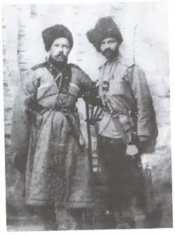 ![]() Военфельдшер 3-го линейного полка Кубанского казачьего войска вольноопределяющийся И. Л. Сорокин. г. Майкоп. 1914 год. | ||||