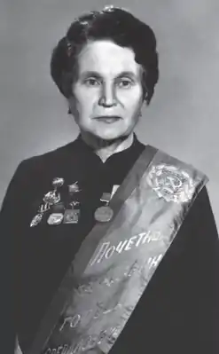 Участница Великой Отечественной войны. С 1942 года находилась в действующей армии в должности начальника госпиталя[2]. Участвовала в битвах на Волге, Курской дуге. Награждена орденами Красной Звезды, Отечественной войны II степени (06.04.1985)[4], медалями «За отвагу»[5], «За оборону Сталинграда», «За победу над Германией» и другими. Войну прошла до Берлина, где познакомилась со своим будущим мужем[2].