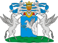 Описание герба: В щите, имеющем голубое поле, виден вылетающий из облака в правую сторону серебряный пегас, у которого между копыт изображены семь золотых шестиугольных звезд. Щит увенчан дворянским шлемом и короной. Намёт на щите голубой, подложенный серебром. Щит держат два крылатых пегаса. |