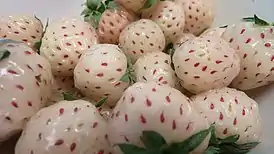 - 'Пайнберри' ('Pineberry'). Оригинатор: VitalBerry BV (Нидерланды), автор — Ханс де Йонг[16]. В первой публикации на немецком языке в апреле 2009 года назван Ananaserdbeeren или земляника ананасная[17]. Представляет собой гибрид чилийской земляники, произрастающей в Южной Америке, и виргинской земляники, произрастающей в Северной Америке. Мякоть плода может варьироваться от белого до оранжевого цвета, имеет сильный аромат и вкус ананаса. К болезням эти ягоды устойчивы. Для рынка Великобритании ягоды были названы «пайнберри» (англ. pineberry)[18][19][20]. Пайнберри выведены из дикой земляники, происходящей из Южной Америки, где она была на грани исчезновения до 2003 года, когда группа голландских фермеров объединила усилия по сохранению вида. Зрелые ягоды почти полностью белые, но с красными семенами[21]. Пайнберри меньше, чем большинство сортов земляники садовой, размером от 15 до 23 мм. Она выращивается в теплицах, как и другие теплолюбивые сорта. Незрелые ягоды имеют зелёный цвет, затем белеют. Когда на ягодах появляется множество тёмно-красных семян, они считаются спелыми[20].