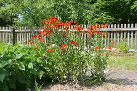 - 'Indianersommer' Zur Linden 1988. Стебли средней высоты. Соцветия оранжево-красные с желтоватым. Цветение с начала августа. Рекомендуется выращивать на плодородных почвах[14].