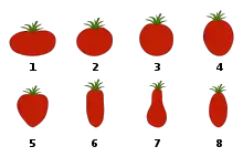 | Сортогруппа Де Барао | Среднепоздний или поздний | Индетерминированный | Нештамбовый | Различных окрасок, 60-80 г | Внутри сортогруппы сорта отличаются только окрасками (существуют красные, розовые, оранжевые, розовые, чёрные и золотые). Консервный, хотя пригоден для потребления в свежем виде. Слабо поражается болезнями. Куст высокорослый, индетерминантный, может достигать высоты более 2 м. Зелёные плоды хорошо дозревают и благодаря плотной кожице могут храниться до двух месяцев. От всходов до плодоношения 130 дней. | |