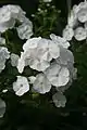 - 'White Eye Flame' (syn. Phlox paniculata Flame™ Series White Eye; 'Barsixty' PP22211 CPBR4170)) G.B.H. Bartels, 2005. Сорт выделен среди сеянцев в Bartels Breeding B.V. (Нидерланды). Компактный сорт. Разработан для выращивания в контейнерах. Высота 30—45 см, ширина около 30 см. Цветки белые с фиолетово-пурпурным глазком. Хорошая устойчивость к грибным заболеваниям[30][31][32].