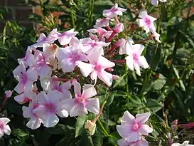- 'Junior Fantasy'. Серия компактных флоксов «Junior» разработана для выращивания в контейнерах. Высота 40—45 см. Повторное цветение хорошо выражено. Цветки светло-розовые с красноватым глазком. Устойчивы к грибковым заболеваниям[25].