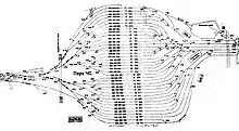 - Заграждающее устройство — стационарное устройство, в заграждающем положении, препятствующее выходу вагонов за пределы сортировочного пути.[3]