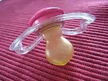 - пустышка, как правило, состоит из трёх частей: резиновой соски без дырочки, кружочка, ограничивающего глубину погружения соски в рот, и пластмассового фиксатора. Внутренний конец фиксатора иногда выступает за кружочек и часто травмирует ребёнку десны. Настоятельно рекомендуется фиксатор удалять.[3]